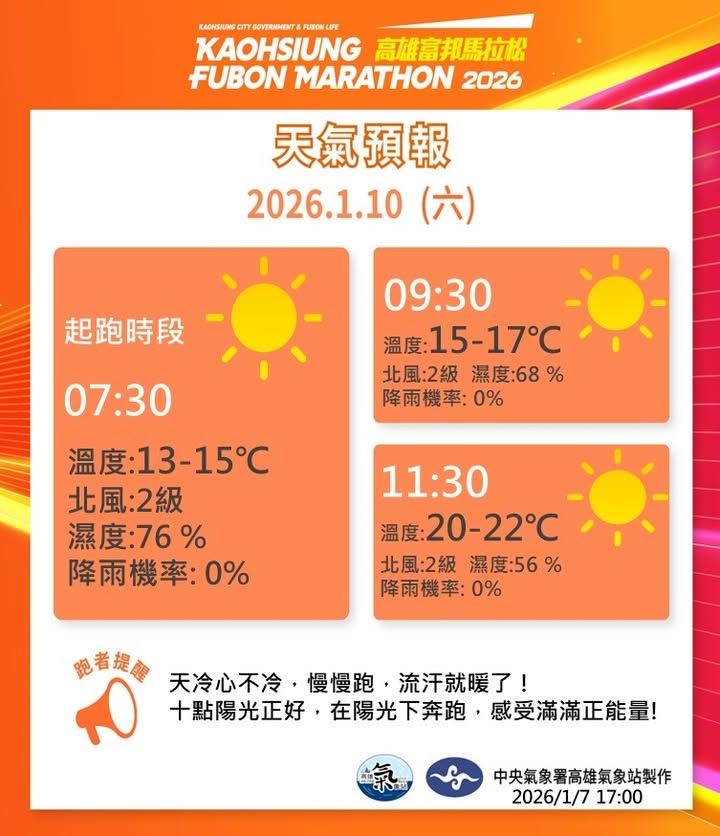 強烈大陸冷氣團影響稍減弱,白天氣溫將略為回升。清晨起跑前仍偏涼,提醒跑者可先多穿保暖衣物禦寒,並做好充分熱身。開跑後隨著陽光露臉,南台灣溫暖的冬天陽光將逐漸回歸,請好好享受沿途賽道風景,跑出好心情!